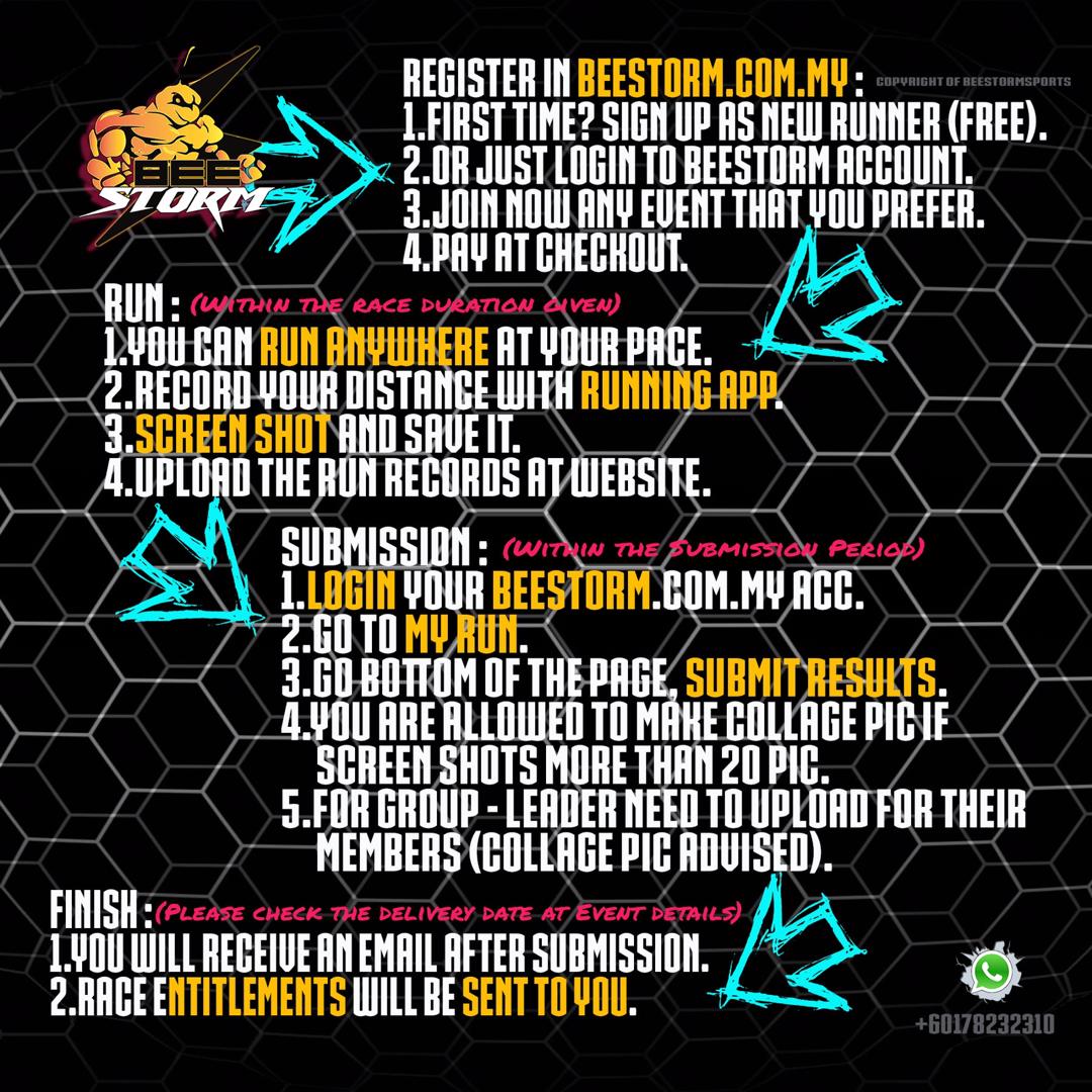 2. Participants must complete the run and required to upload your proof of run photo online at www.beestorm.com.my under "MY RUN". Photo must contain proof of completed running distance. (PLEASE WA IF YOU ARE HAVING TROUBLE +60178232310).