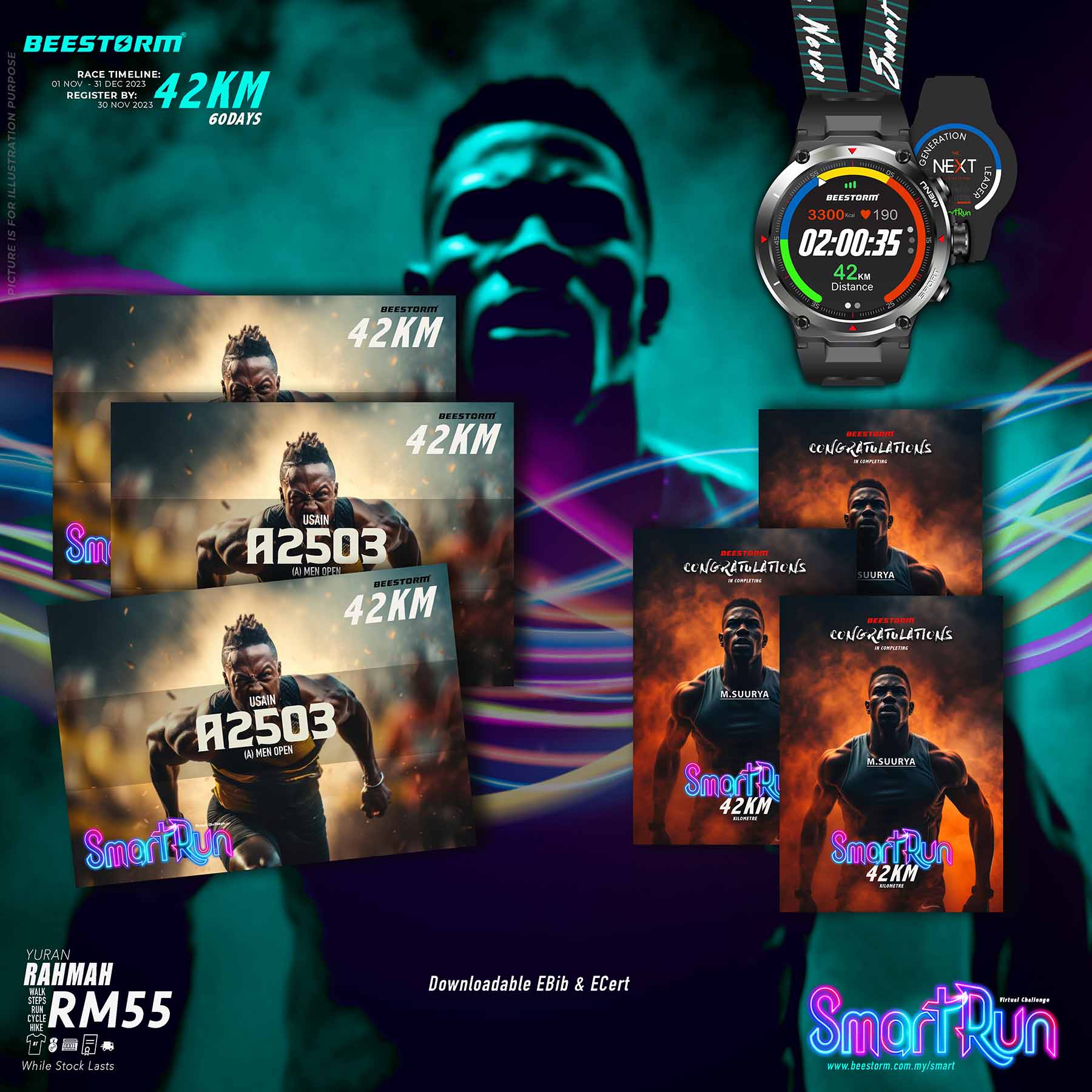 1. Participants who opt for SMART RUN 42KM VR you will have 60 Days to complete the challenge. E-Bib can be downloaded from "My E-Bib”, RIGHT AFTER YOU HAVE REGISTERED.