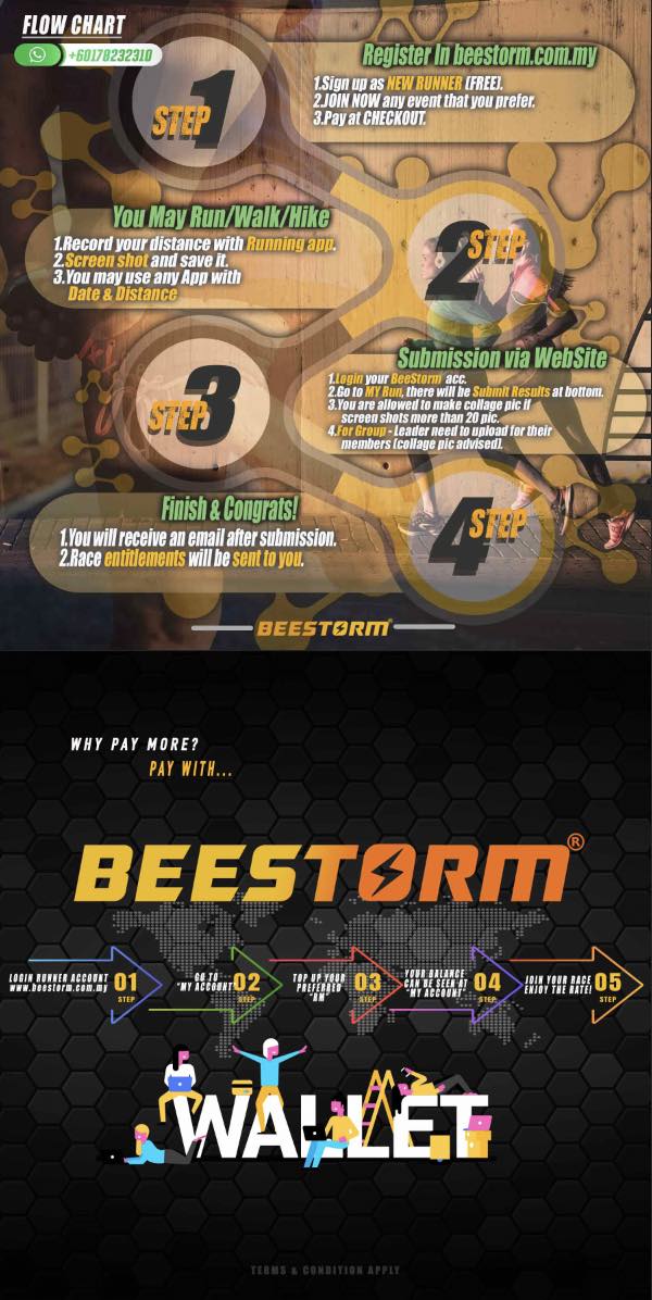 2. Participants must complete the run and required to upload your proof of run photo online at www.beestorm.com.my under "MY RUN". Photo must contain proof of completed running distance. (PLEASE WA IF YOU ARE HAVING TROUBLE +60178232310).